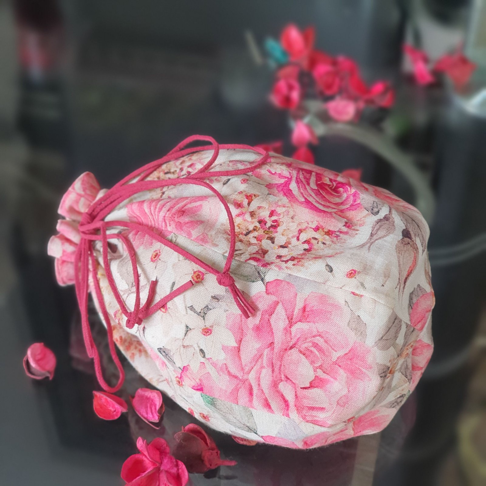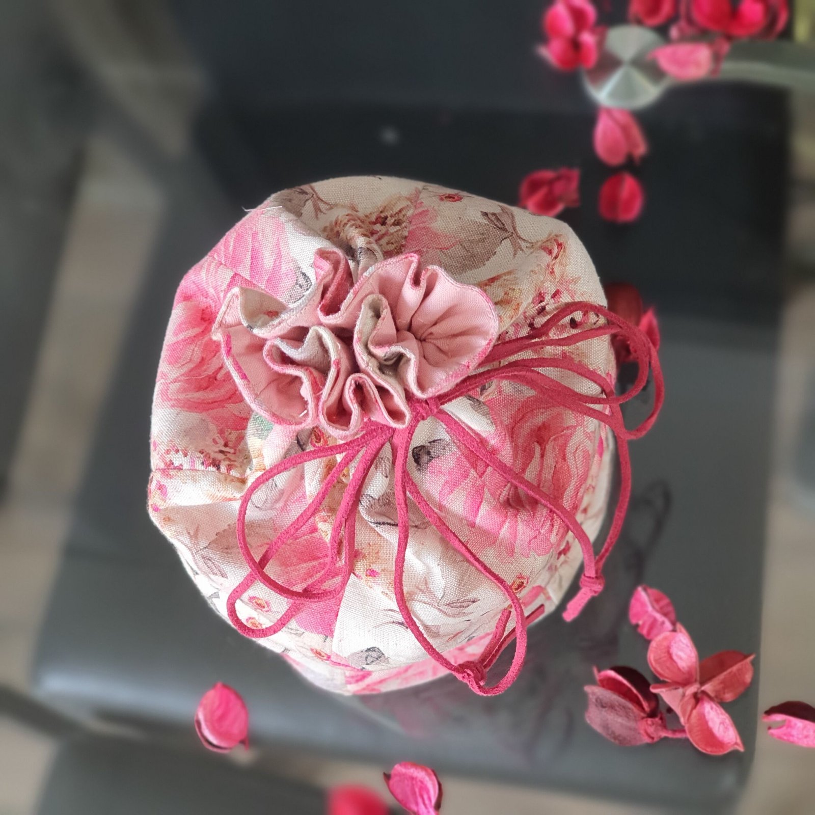 This Rose Pink Potli Bag is made from premium soft cotton and Satin lining. The unique bag design is a 6 piece cut stitched together and the string is attached. The tassels at each